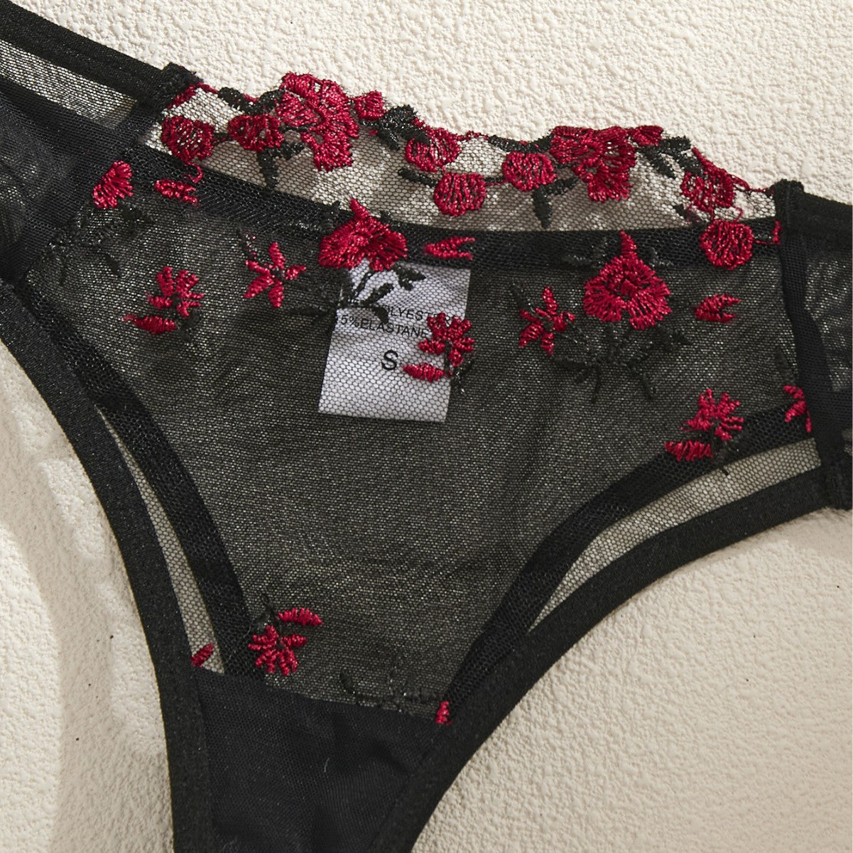 This exquisite transparent mesh lingerie set features intricate floral embroidery and a supportive push-up design crafted from premium polyester for sophisticated allure.