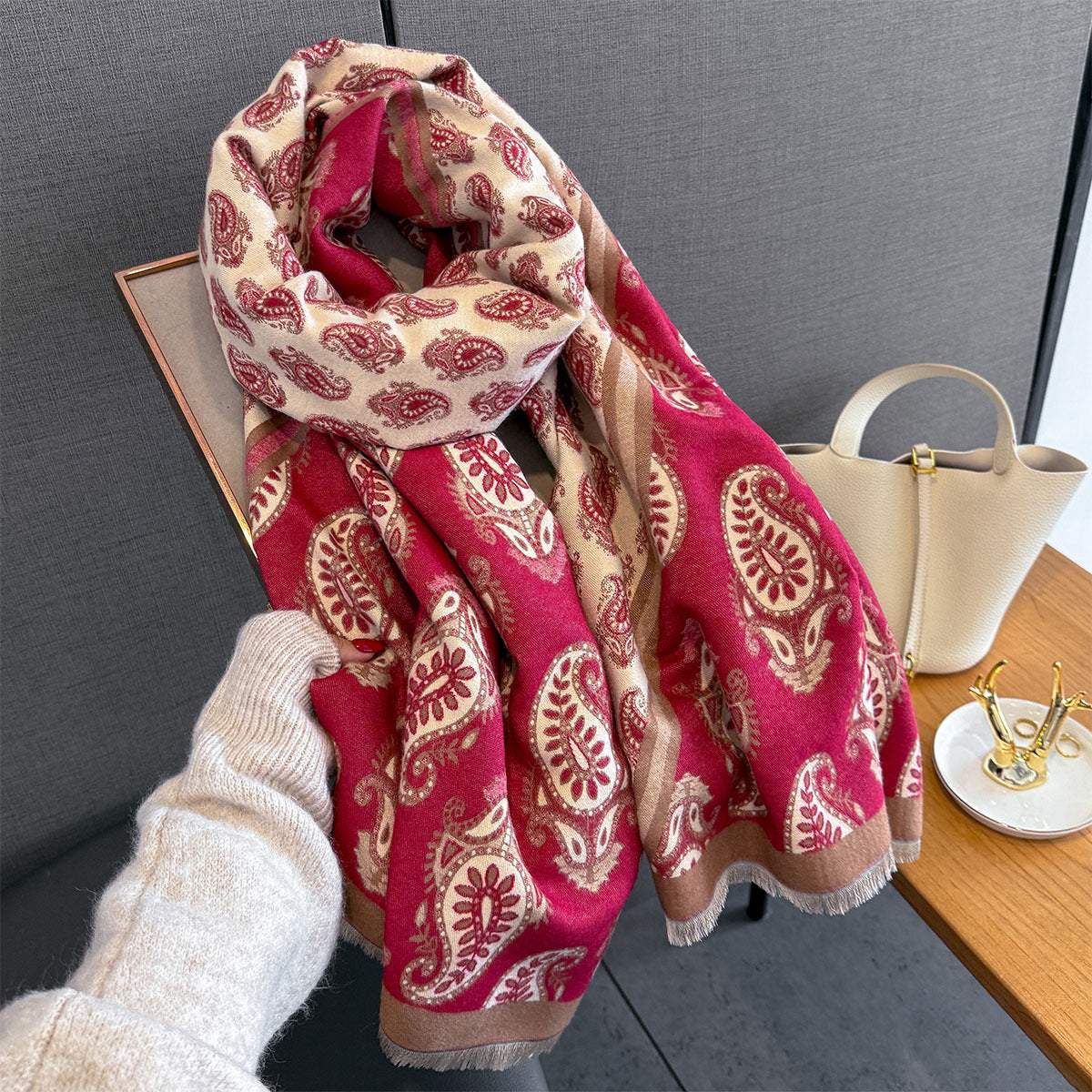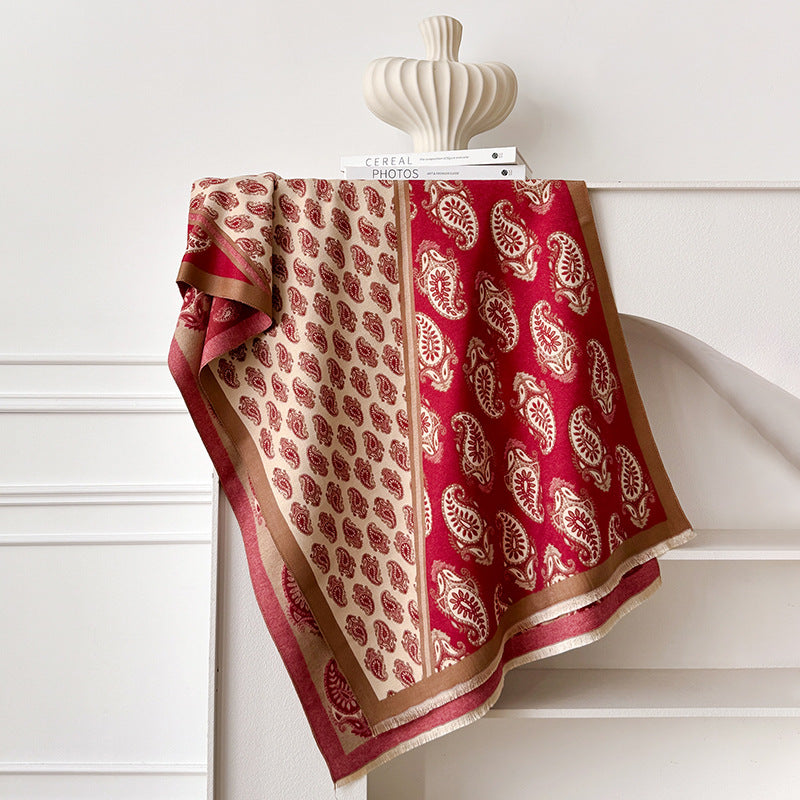 Elegant Double-Sided Red Paisley Cashew Flower Printed Winter Shawl