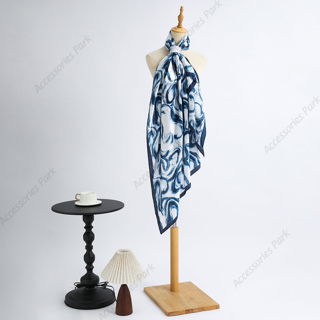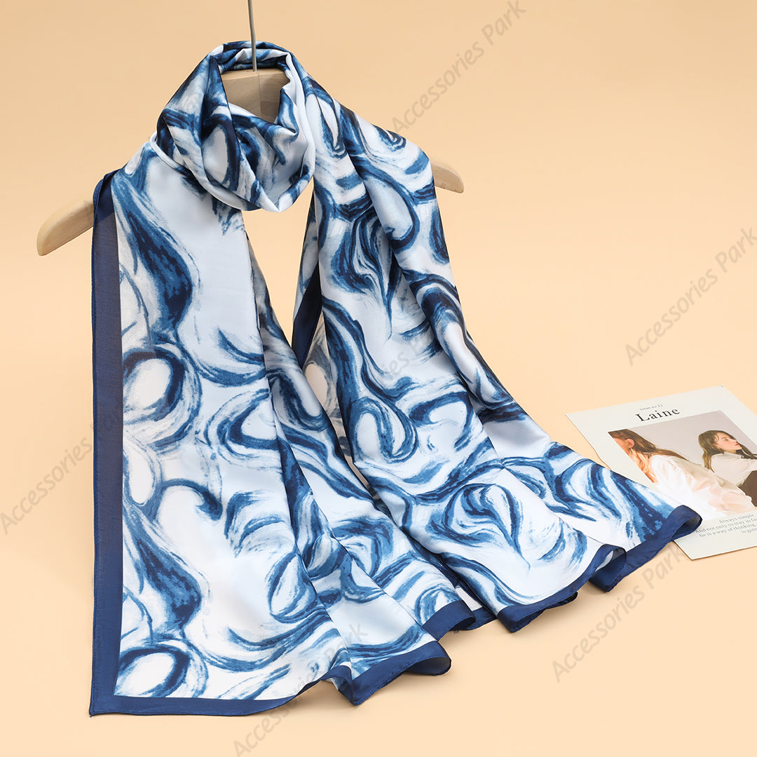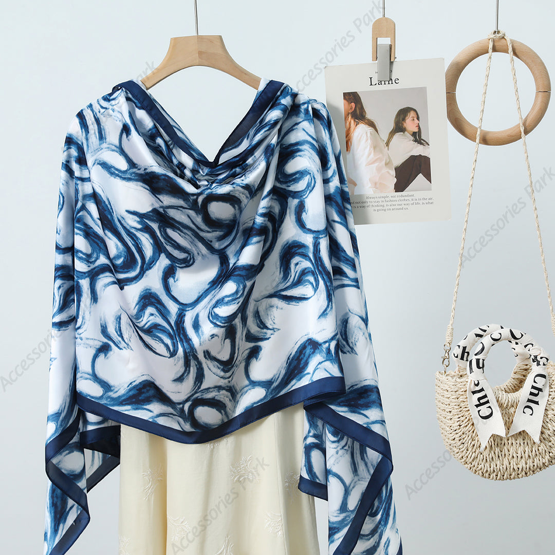 Aqua Blue Oil Painted Design Beautiful Wave Satin Silk Scarf