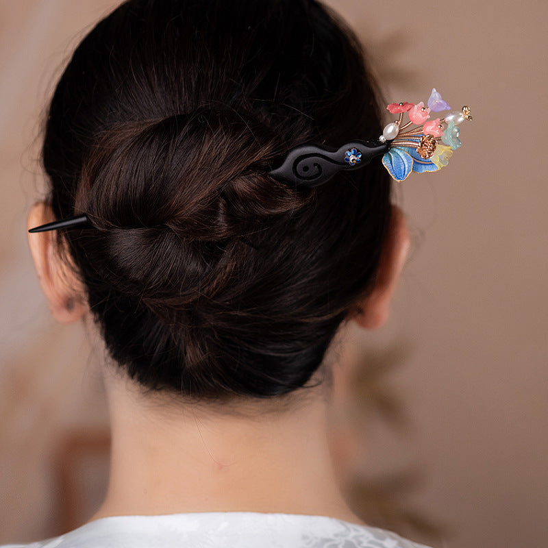 This masterfully handcrafted wooden hairpin features intricate three-dimensional fabric flowers that provide a timeless aesthetic for weddings, festivals, or sophisticated daily wear.