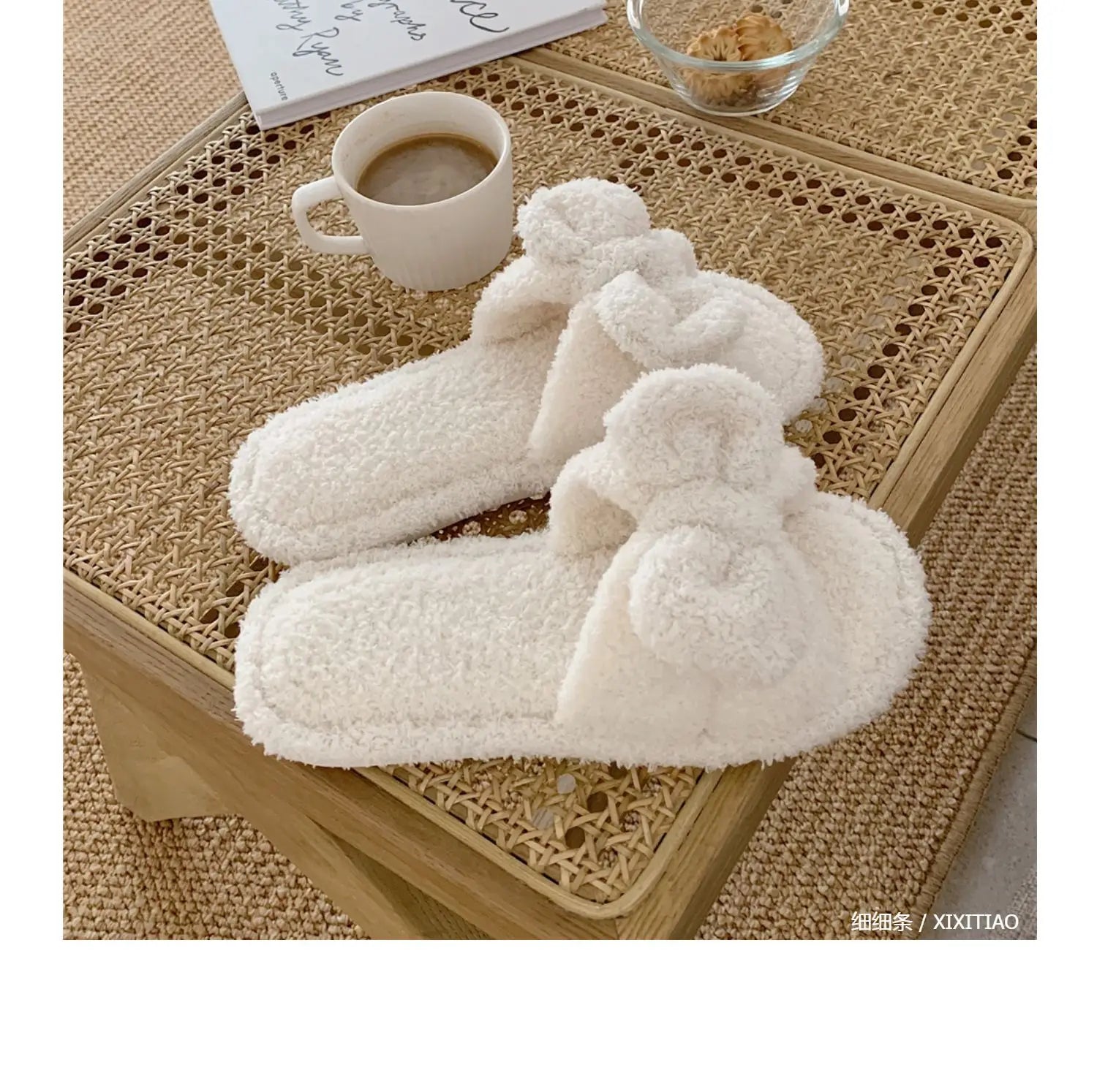 Korean Style Girls Vintage Fluffy Bow Winter Warm Slippers